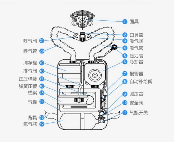 氧氣呼吸器是隔絕式呼吸防護(hù)用品之一,他可以為我們抵擋有毒有害物質(zhì)對呼吸系統(tǒng)的傷害。主要用來給消防人員或作業(yè)人員在搶險救援或危險作業(yè)環(huán)境下提供安全防護(hù),由于使用情況特殊,正壓式氧氣呼吸器的正確操作尤其重要,要想了解其操作,首先還得熟悉它的部件組成,因為只有了解了氧氣呼吸器的主要組成部分及各部分作用,才能更好的掌握它的操作。,今天滄州金盾就來介紹下正壓式氧氣呼吸器各個組成部分的功能,幫助大家更好的了解正壓式氧氣呼吸器。